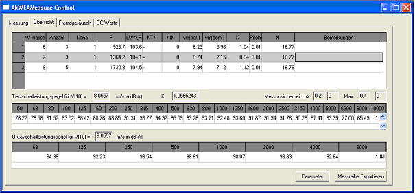 Nach Betätigen der Schaltfläche „Parameter“ können alle Daten die zu Beginn der Messung eingegeben worden sind verändert werden Alle Parameter außer „Höhe des Anemometers (z)“, „Abstand Mikrofon – Mitte Turm (R0)“ und „Höhe Fußpunkt Turm – Höhe Mikrofon“ beeinflussen alle Einzelmessungen.